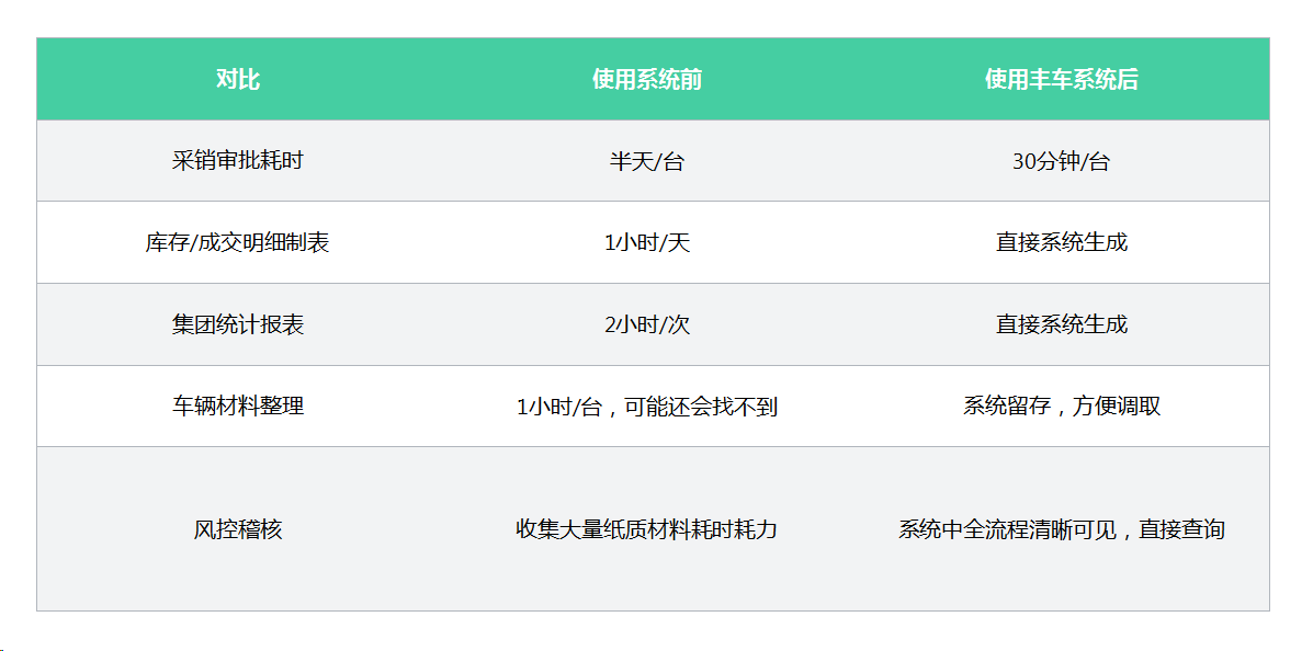 丰车为捷成开发的二手车管理系统,从二手车线索、车辆管理、车辆采销审批、财务收付审批、车辆报表等全方位助力二手车业务发展。通过小程序、APP、邮件等多终端支持让包括总经理、财务等重要管理岗位人员实时参与业务管理,大大提升业务执行效率。